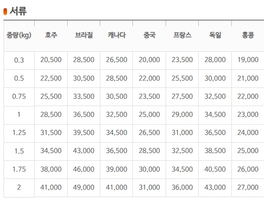 EMS 요금표는 중량별로, 국가별로 다르게 적용됩니다.